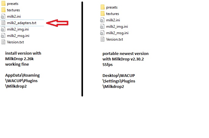 One thing that might be useful is to see what the level of gpu usage is when the 'broken' milkdrop is running as well as the general WACUP cpu usage. Also are you using the built-in FPS display option or something else to determine the frame rate?